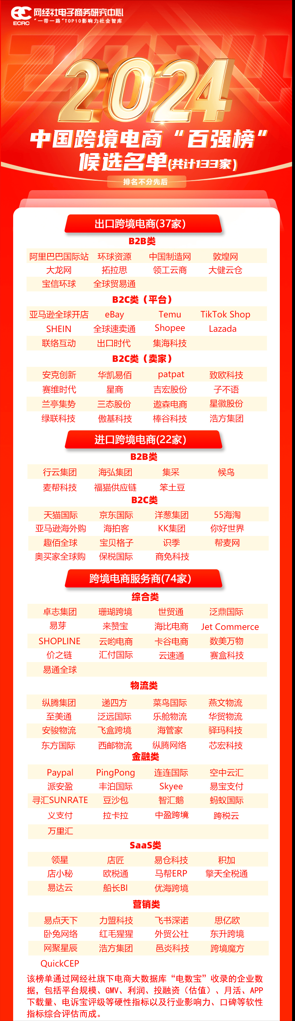 该榜单颠末网经社电子商务研究核心按照电商大数据库“电数宝”收录的企业数据,包罗平台规模、营收、利润、投融资(估值)、月活、评级等硬性目标以及行业影响力、口碑等软性目标分析评估而成,此后将通过专家评审、收集公示、企业搜集、企业报名等体例发布,正式榜单将通过《2024年度中国跨境电商市场数据演讲》发布。